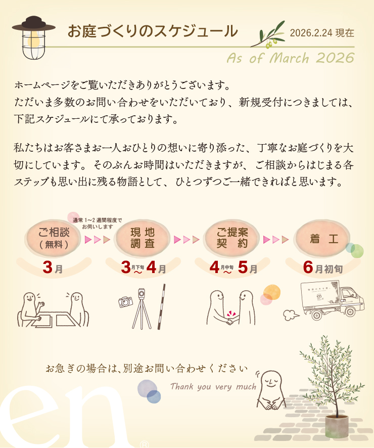[2/24update] お庭づくりのスケジュール Posted 2020年8月24日 by FA建設工業en 各項目の詳しい内容につきましては、こちらをご覧ください。 https://www.en-fa.co.jp/company/#cont_flow 次回の更新は3月23日です。